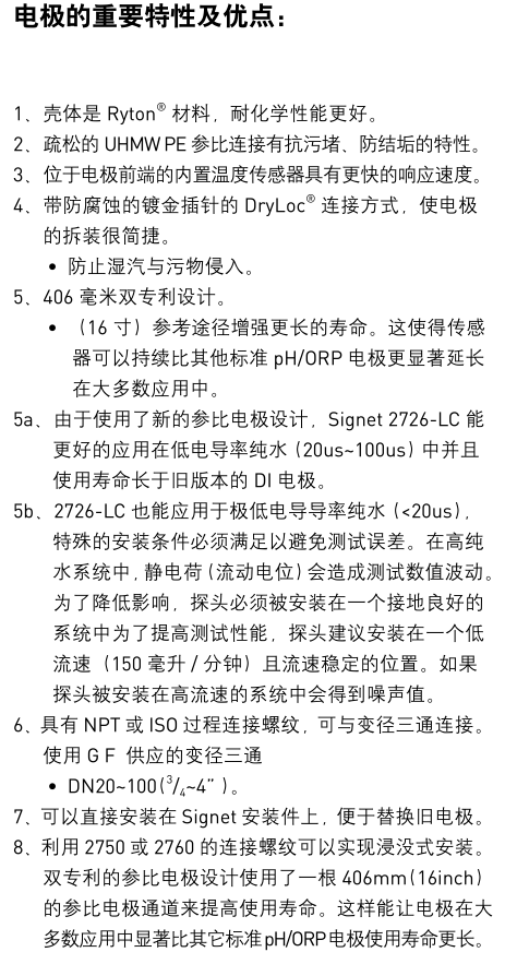 pH 電極的溫度補償電阻不論是 PT1000 還是 3kΩ,響應(yīng)時間都很快。這些電極都能與 Signet pH/ORP 儀表兼容。2724-2726 系列電極適合大范圍的普通目的應(yīng)用。 3 / 4 ”NPT 或 ISO 7/1-R? 3 / 4 連接螺紋可以方便地與標(biāo)準(zhǔn)三通安裝件連接。也可以直接安裝在標(biāo)準(zhǔn)的 Signet 安裝件上,DN15~100( 1 / 2 ~4”)。