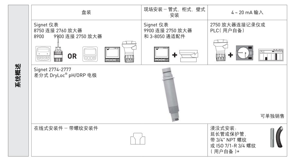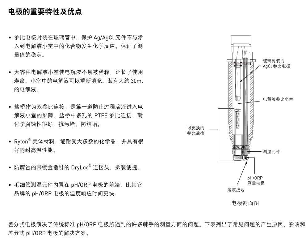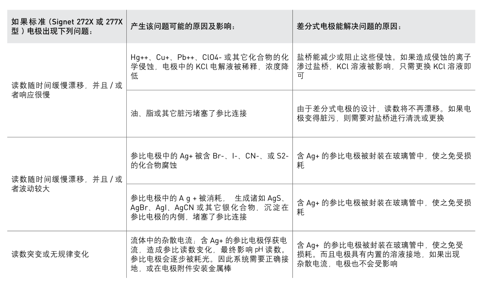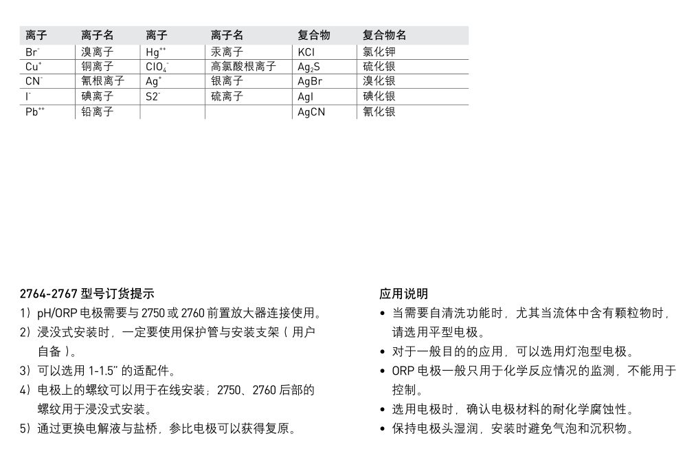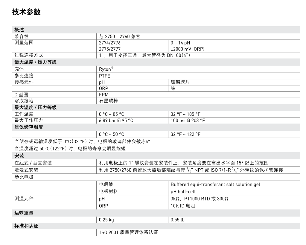 Signet 2764-2767 差分式 pH/ORP 電極有 DryLoc ? 連接頭,Ryton ? 殼體,PTFE 參比連接,能夠?qū)ψ羁量袒瘜W(xué)品進(jìn)行測(cè)量。差分式電極采用了當(dāng)前先進(jìn)的三電極技術(shù):pH 電極與參比電極都對(duì)地電極進(jìn)行測(cè)量,確保測(cè)量信號(hào)的穩(wěn)定。差分式電極的一個(gè)重要特點(diǎn)是參比電極被包裹在參比液小室中的玻璃管中,使之免受含有硫化物 (S2-) 和重金屬溶液的侵蝕。為了延長(zhǎng)使用壽命,電解液可以重新填充,鹽橋可以更換,二者都可以在現(xiàn)場(chǎng)完成更新。多孔的PTFE 參比連接是專利設(shè)計(jì),抗臟污能力強(qiáng),減少堵塞與化學(xué)腐蝕。電極結(jié)構(gòu)還包括溶液接地,pH/ORP測(cè)量電極,測(cè)溫元件。溶液接地可以泄放從參比電極游離出的雜散電流從而消除測(cè)量干擾。pH/ORP 電極分為平型與燈泡型兩種,測(cè)溫元件內(nèi)置在電極的端部,保證溫度響應(yīng)時(shí)間 T95% 小于 1 分鐘。測(cè)溫元件的種類(lèi)包括 3kΩ,300Ω,PT1000熱電阻。當(dāng)電極與 2750 電子變送組件配用時(shí),可以輸出 4~20mA信號(hào)或輸出數(shù)字 (S 3 L) 信號(hào)與 8900 多參數(shù)控制器配用。當(dāng)與 2760 前置放大器配用時(shí),可以連接到 8750 或5700 儀表上。